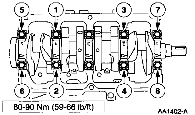 Crankshaft main bearing cap bolts 80-90 Nm (59-66 ft. lbs.)