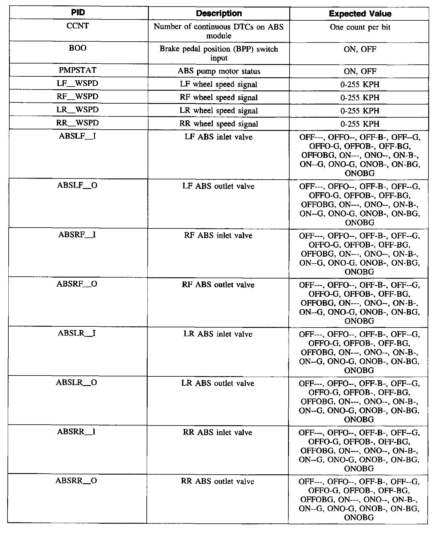 ABS Control Module Parameter Identification (PID) Index