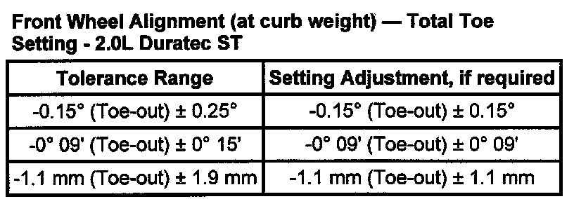 Toe Setting 2.0 L Duratec ST- at Curb Weight Condition