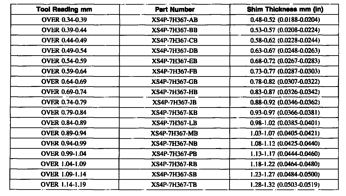 Transfer Shaft Shim Selection Chart