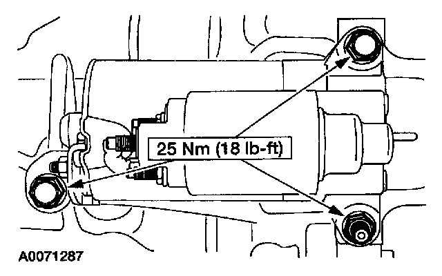^ WHEN WORKING IN THE AREA OF THE STARTER MOTOR, BE CAREFUL TO AVOID TOUCHING HOT EXHAUST COMPONENTS.