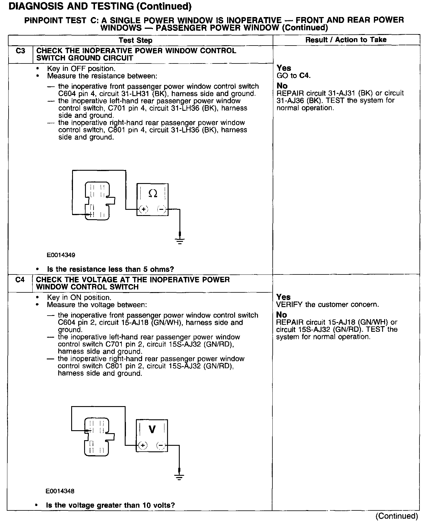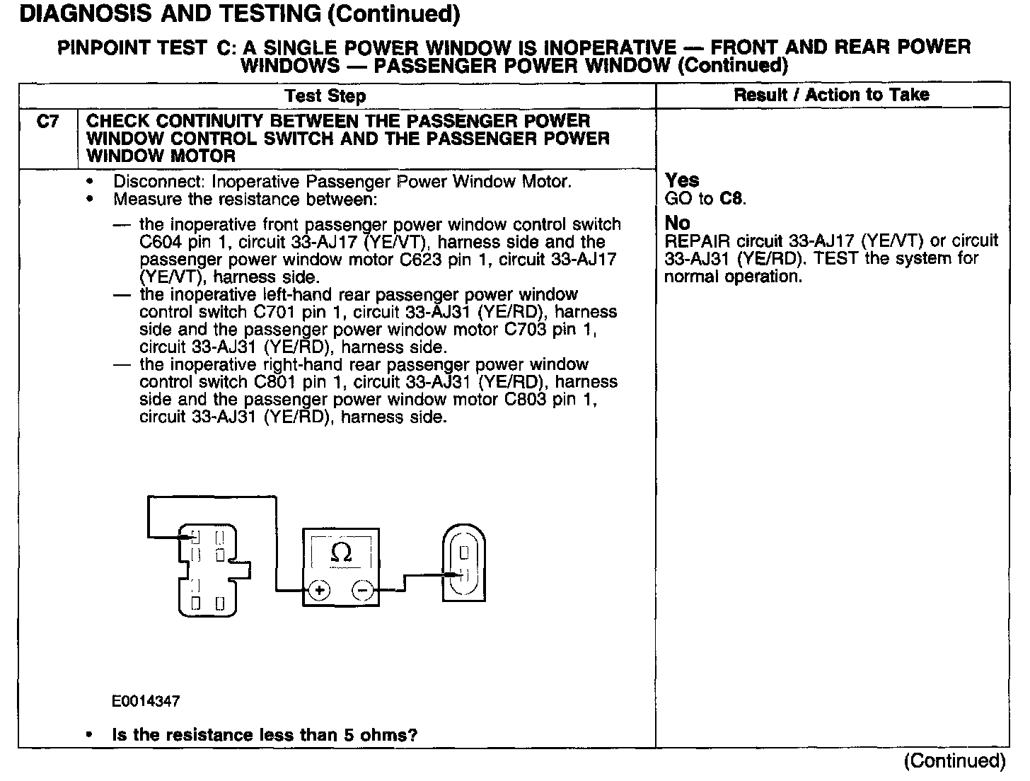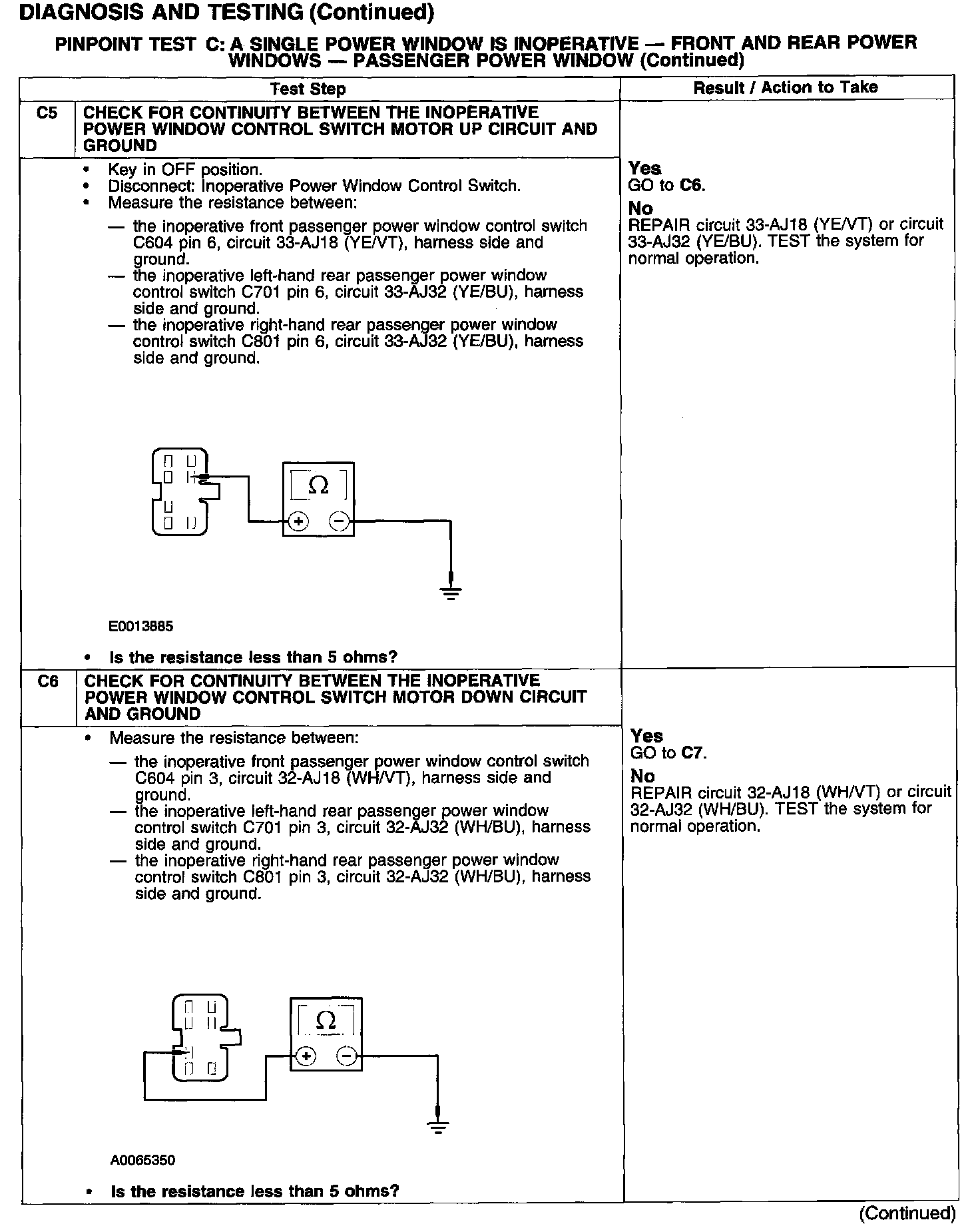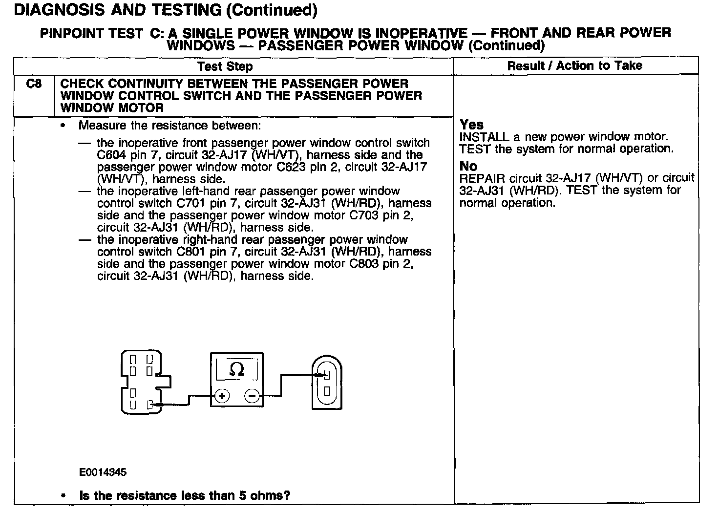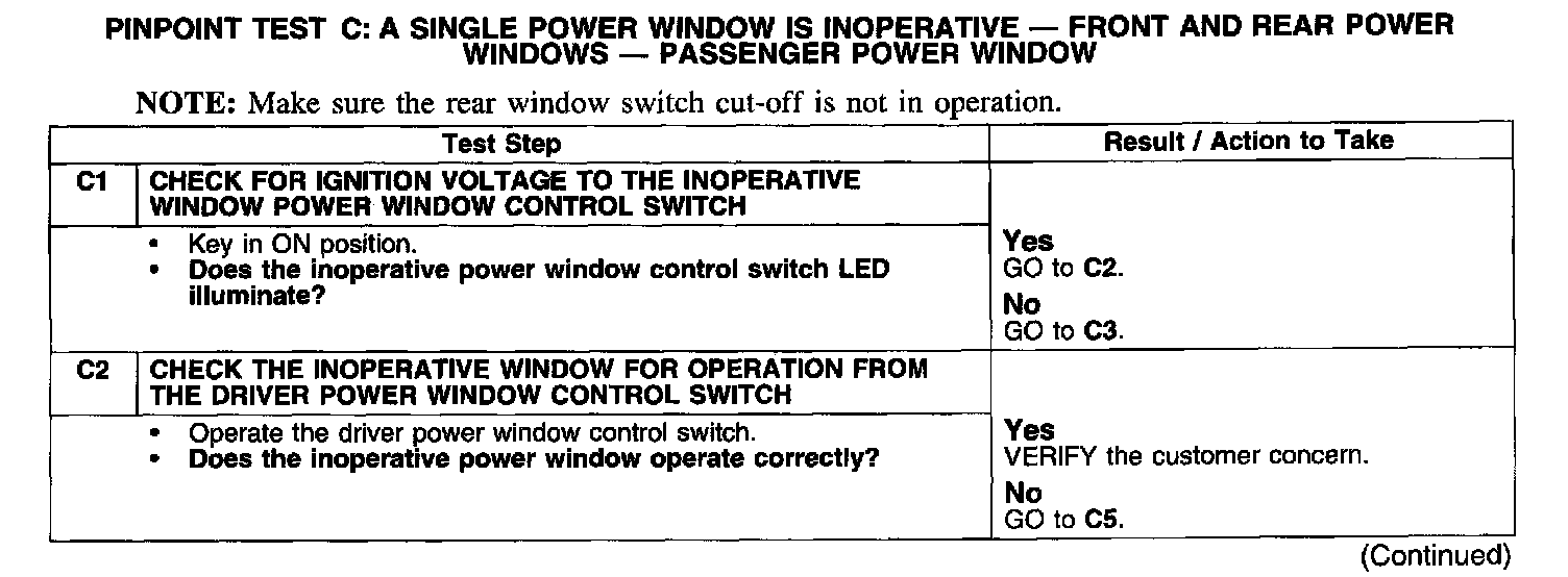 PINPOINT TEST C: A SINGLE POWER WINDOW IS INOPERATIVE - FRONT AND REAR POWER WINDOWS - PASSENGER POWER WINDOW