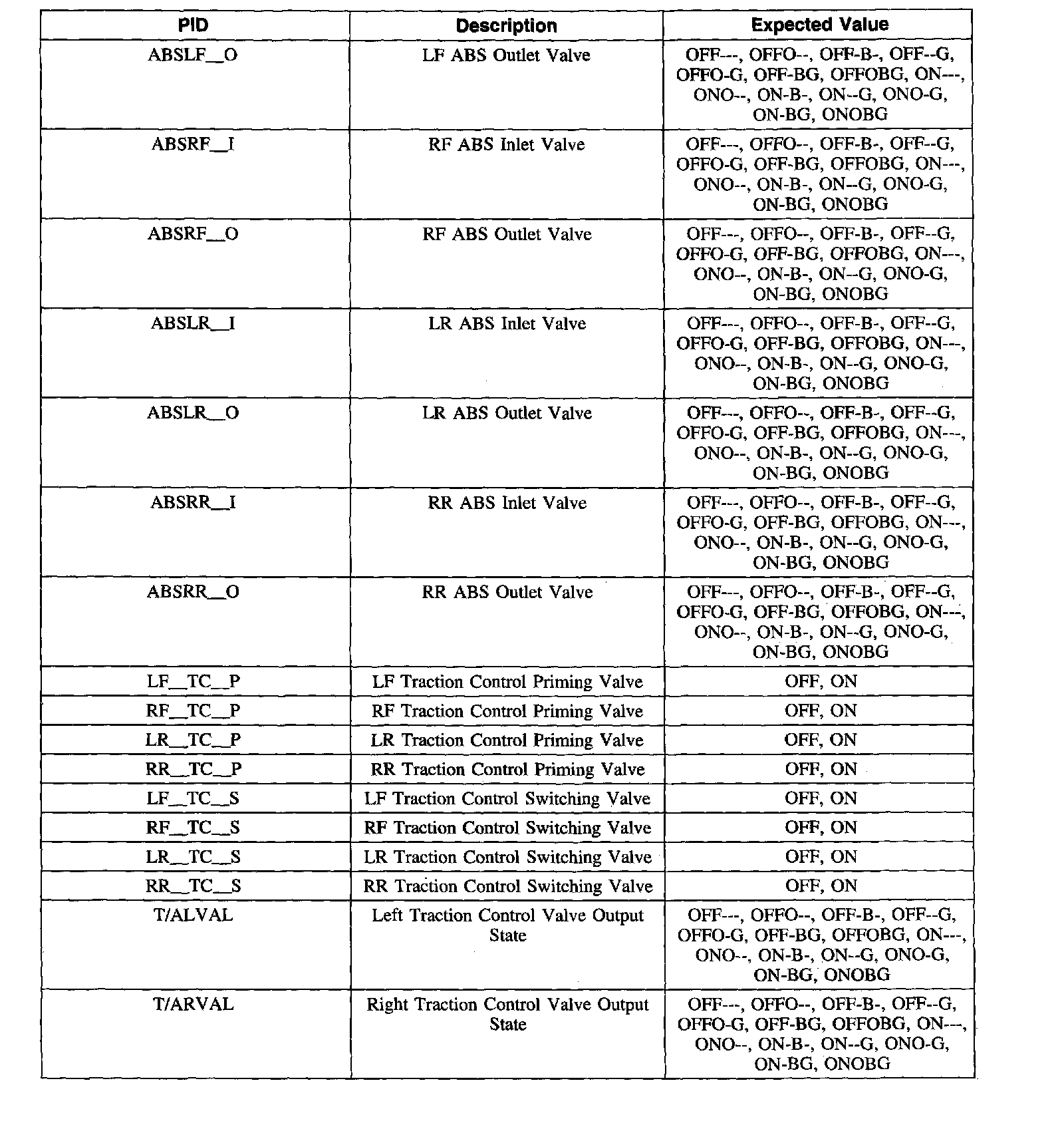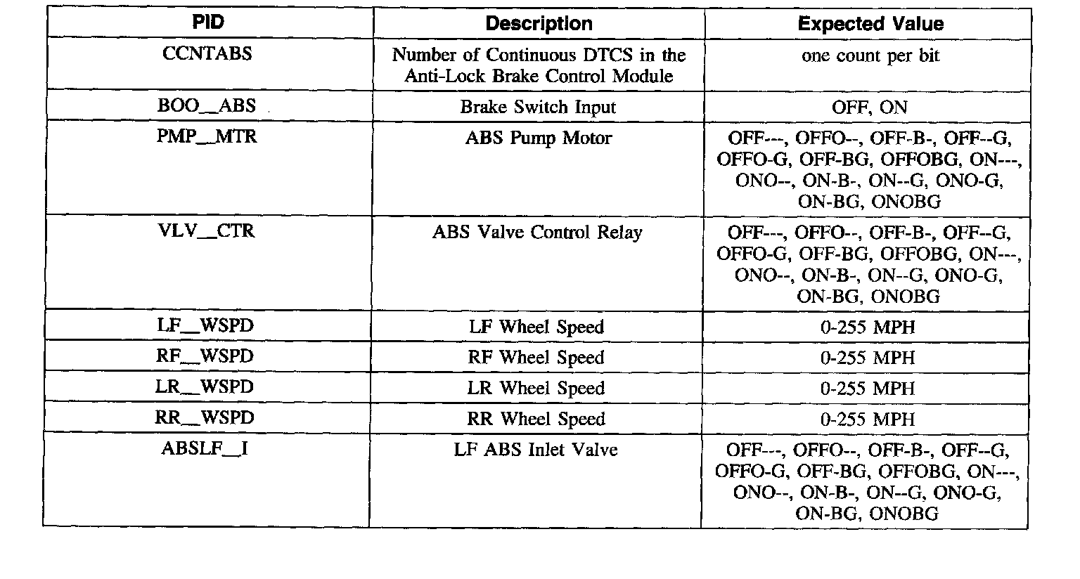 ABS Control Module Parameter Identification (PID) Index