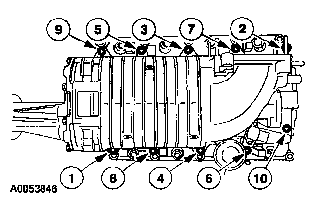 Supercharger and CAC cooler assembly-to-lower intake manifold bolts, in the sequence shown, in two stages.