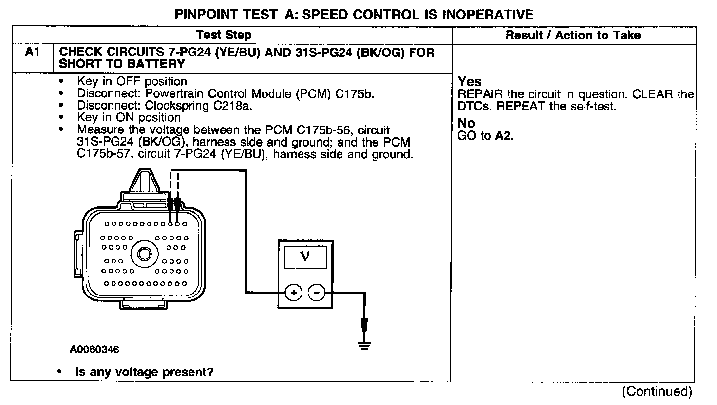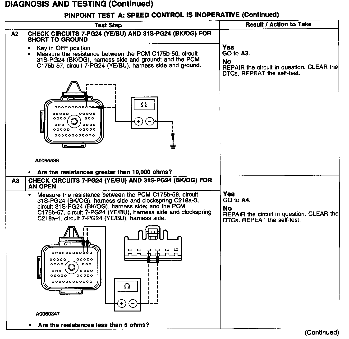 The powertrain control module (PCM) sends a signal through circuit 7-PG24 (YE/BU) to the speed control switches which passes through the clockspring The return signal is sent through circuit 31S-PG24 (BK/OG) and the clockspring.