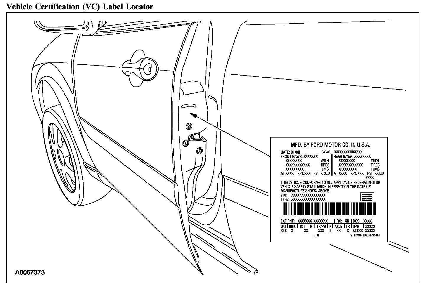 The vehicle certification (VC) label contains the manufacturer name, the month and year of manufacture, the certification statement, and the VIN. It also includes gross vehicle weight ratings (GVWR) and tire information.