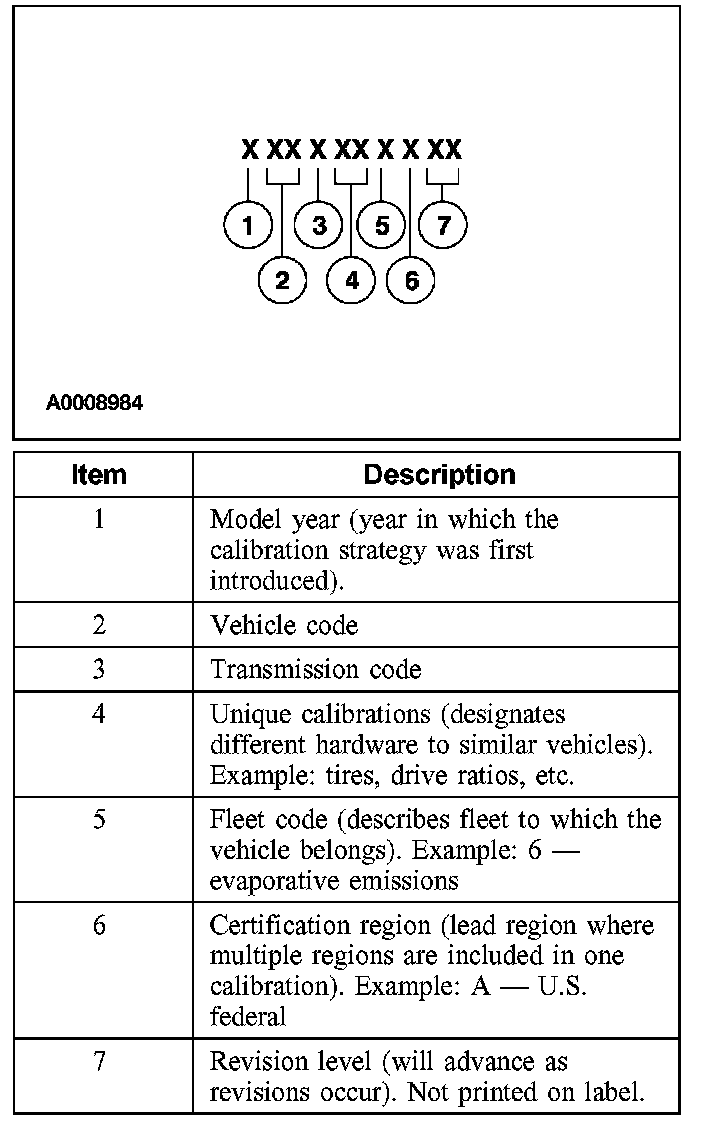 NOTE: Powertrain calibration information is limited to a maximum of five characters per line on the vehicle certification (VC) label. Because of this, calibration identification consisting of more than five characters will wrap to the second line on the VC label.