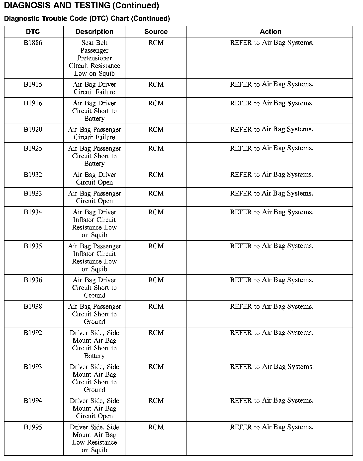 DTC Chart B1886 - B1995: