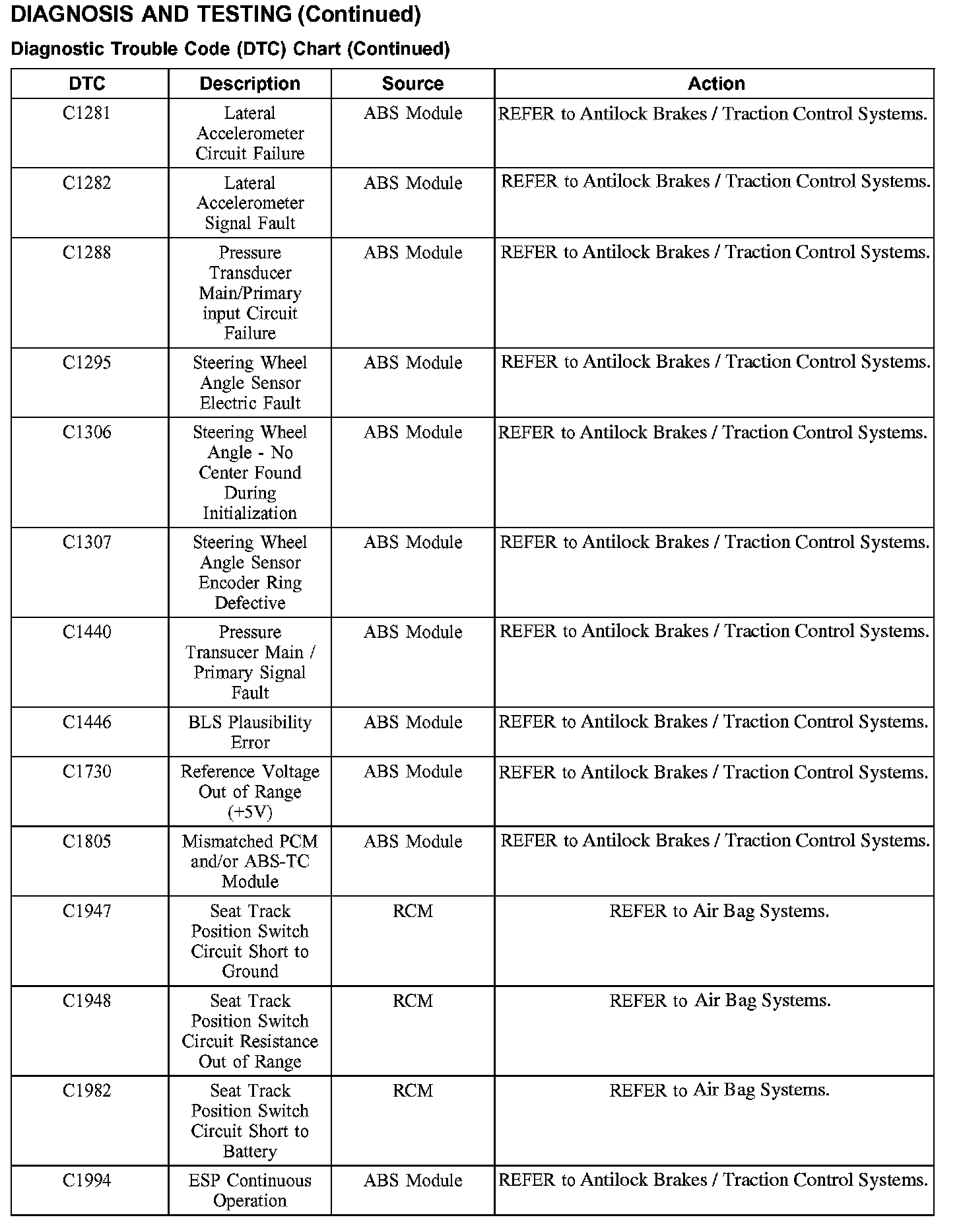 DTC Chart C1281 - C1994: