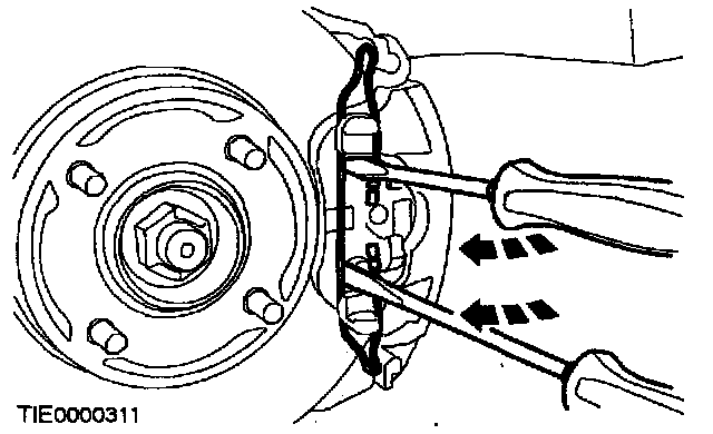 8. Lift the outer pad retaining clip over the spring retaining lugs.