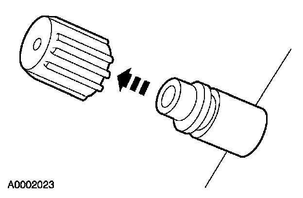 2. Remove the A/C charging valve cap from the low-pressure service gauge port valve.