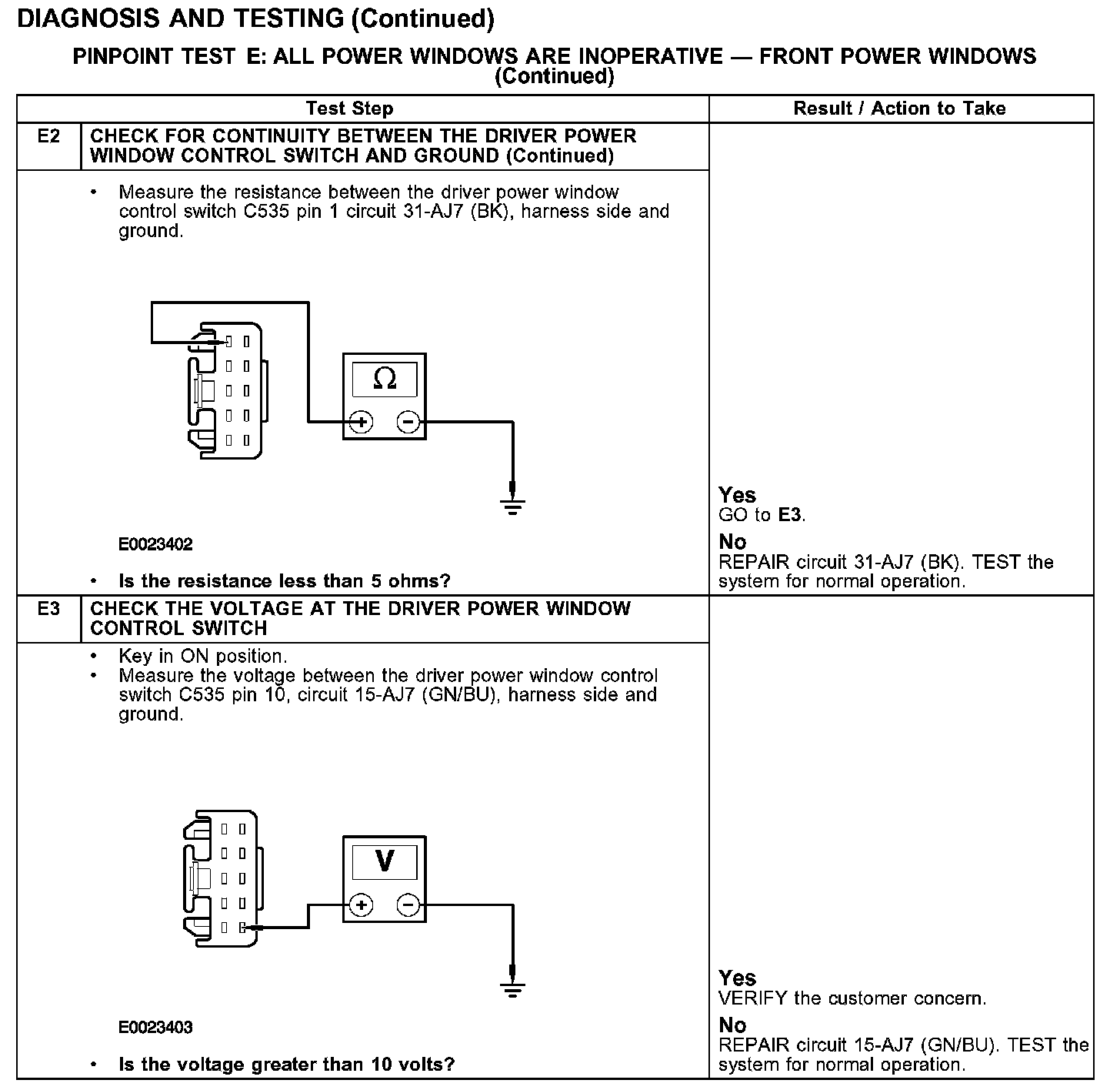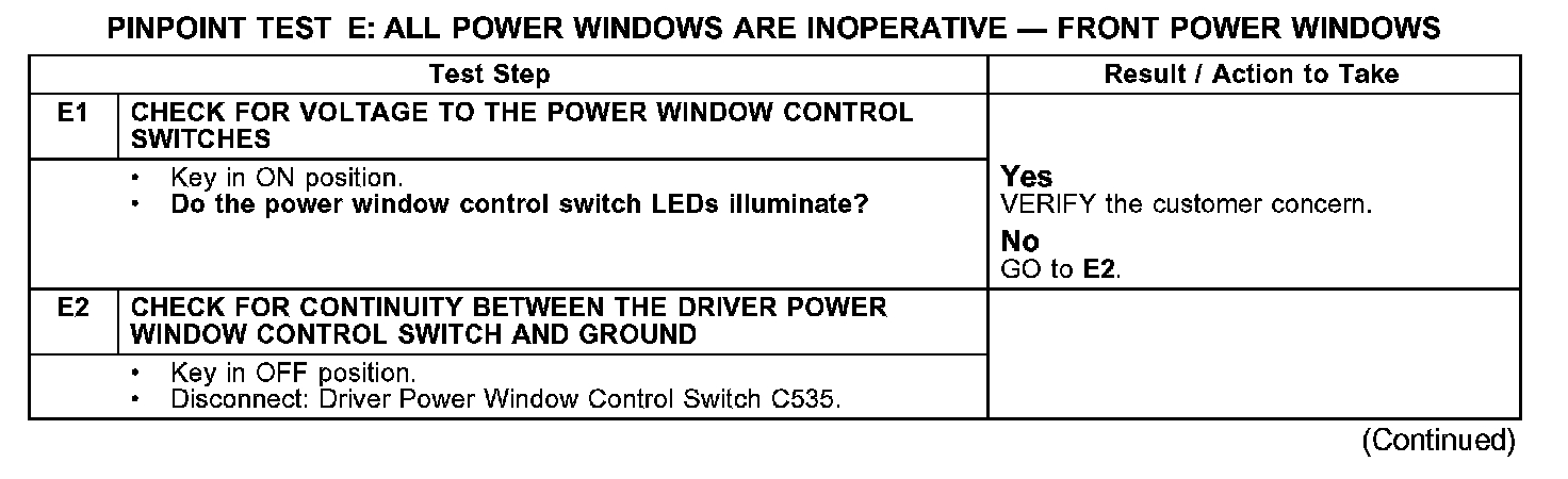 PINPOINT TEST E: ALL POWER WINDOWS ARE INOPERATIVE - FRONT POWER WINDOWS