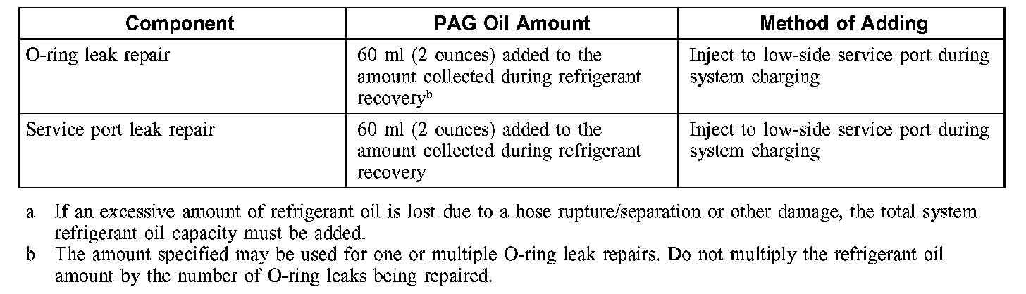 CAUTION: During normal A/C operation, oil is circulated through the system with the refrigerant, and a small amount is retained in each component. If certain components of the system are removed, some of the refrigerant oil will go with the component. To maintain the original total oil charge, it is necessary to compensate for the oil lost by adding oil to the system with the new part.