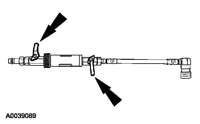 5. Install the dye/lubricant injector between the low-side service gauge port valve and the refrigerant service station or manifold gauge set.