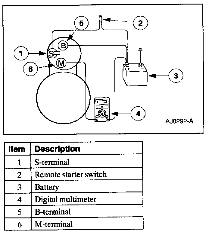 8. Remove the cables from solenoid B-, S- and M-terminals. Clean the cables and connections and reinstall the cables to the correct terminals. Repeat Steps 3 through 6. If the voltage drop reading is still greater than 0.5 volts when checked at the M-terminal and less than 0.5 volts when checked at the B-terminal, the concern is in the solenoid contacts. Install a new starter motor.