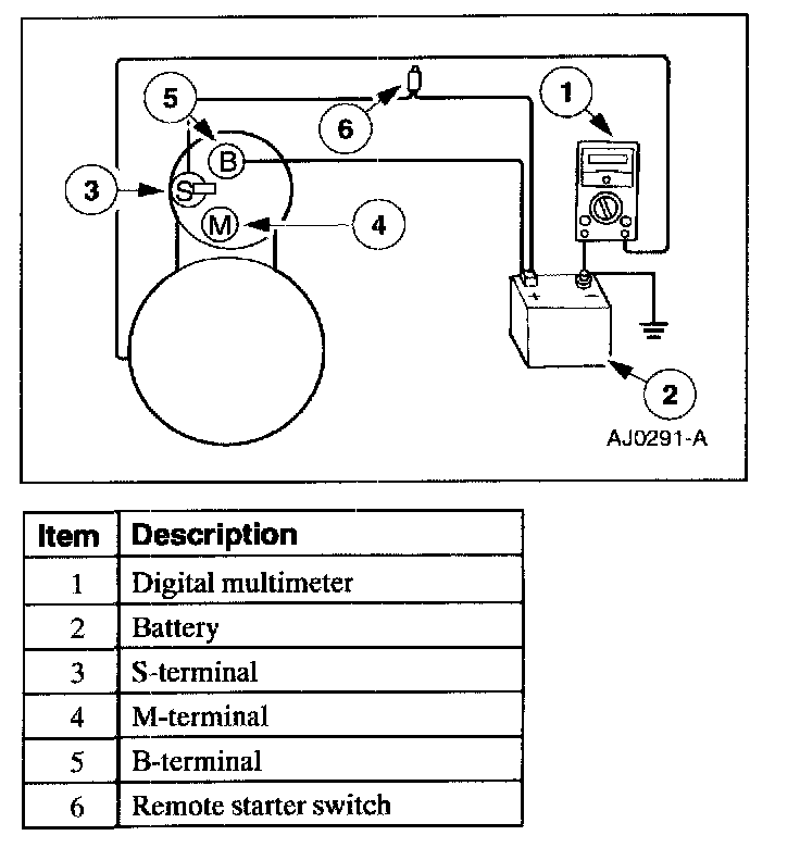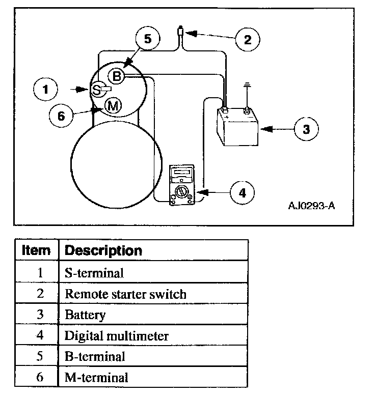 1. Connect the Digital Multimeter positive lead to the starter motor housing (the connection must be clean and free of rust or grease). Connect the negative lead to the negative (-) battery terminal.