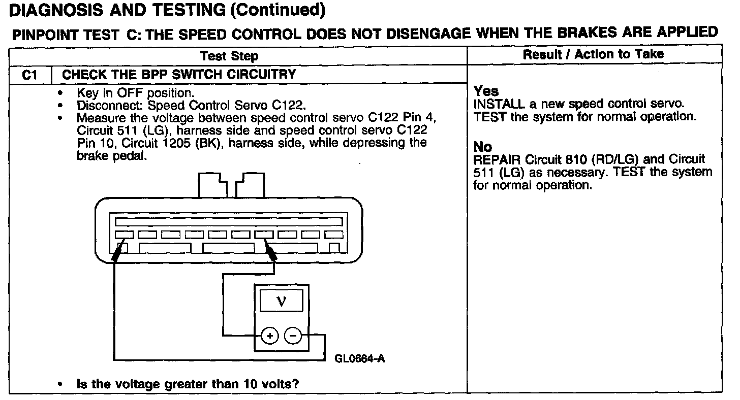 PINPOINT TEST C: THE SPEED CONTROL DOES NOT DISENGAGE WHEN THE BRAKES ARE APPLIED