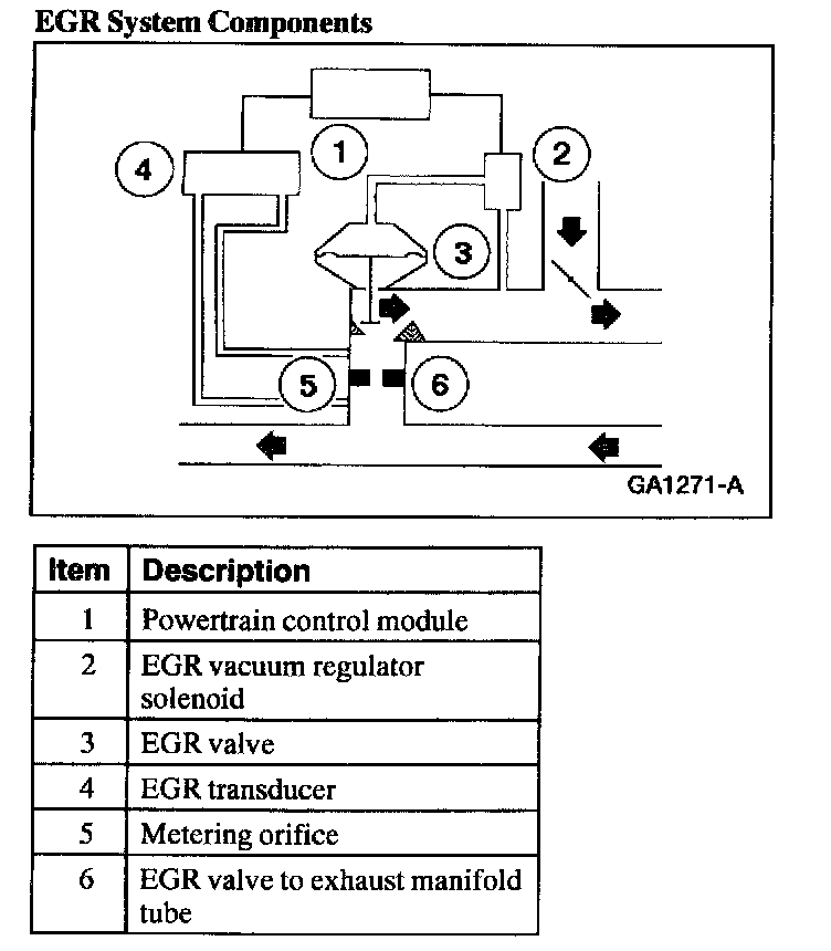 The powertrain control module (PCM) controls the EGR vacuum regulator solenoid. The EGR vacuum regulator solenoid controls the vacuum to the EGR valve. When the EGR valve opens, exhaust gas flows to the intake manifold. The EGR transducer measures the flow through the EGR valve to exhaust manifold tube and sends a signal to the powertrain control module. A metering orifice in the EGR valve to exhaust manifold tube restricts the flow rate when the ECR valve is open.