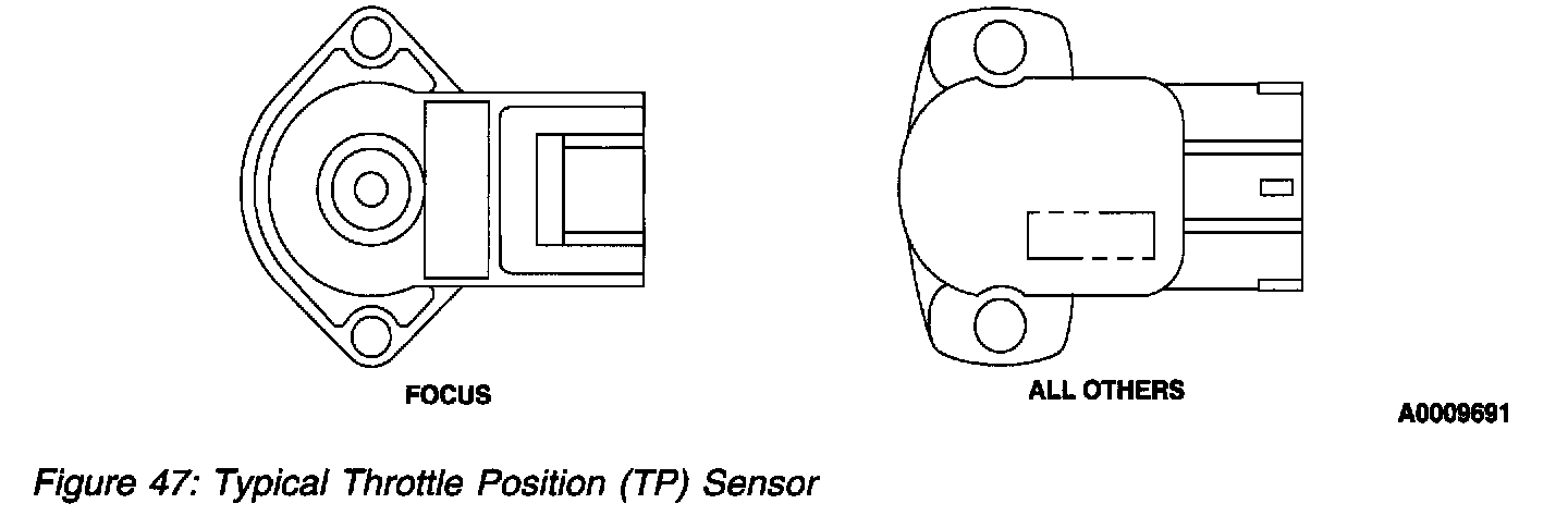 The TP sensor is a rotary potentiometer sensor that provides a signal to the PCM that is linearly proportional to the throttle plate/shaft position. The sensor housing has a 3-blade electrical connector that may be gold plated. The gold plating increases corrosion resistance on terminals and increases connector durability. The TP sensor is mounted on the throttle body. As the TP sensor is rotated by the throttle shaft, 4 operating conditions are determined by the PCM from the TP. Those conditions are closed throttle (includes idle or deceleration), part throttle (includes cruise or moderate acceleration), wide open throttle (includes maximum acceleration or de-choke on crank), and throttle angle rate.