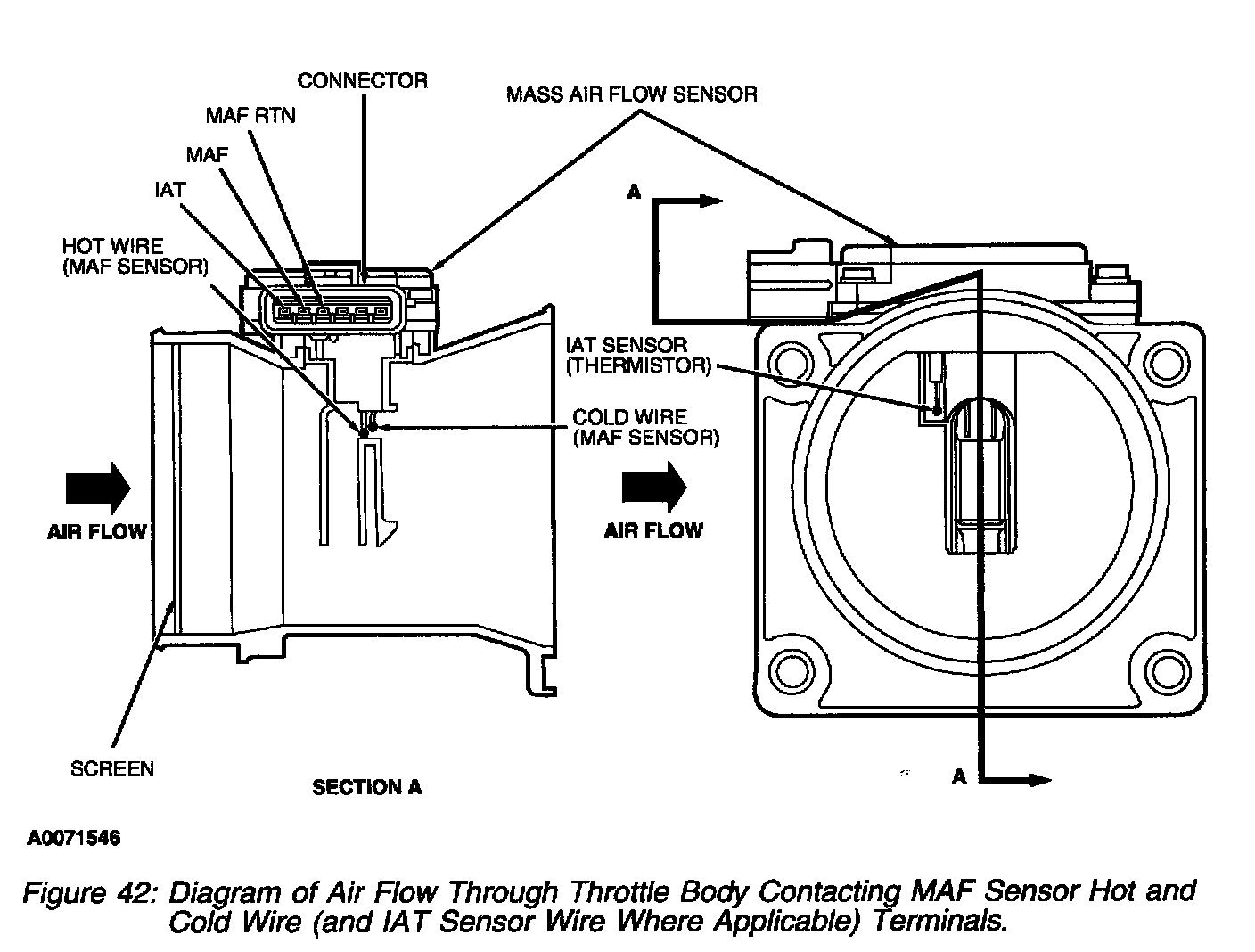Diagram Of Air Flow Through Throttle Body Contacting MAF Sensor Hot And Cold Wire Terminals: