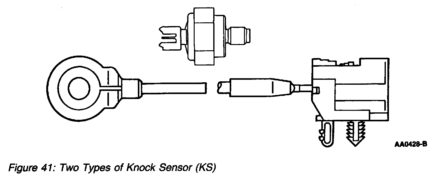 The KS is a tuned accelerometer on the engine which converts engine vibration to an electrical signal. The PCM uses this signal to determine the presence of engine knock and to retard spark timing.