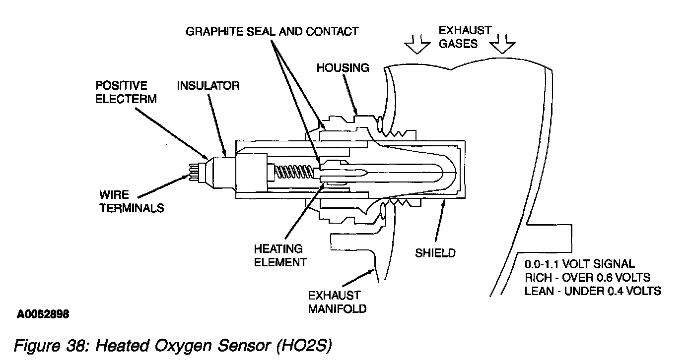 The HO2S detects the presence of oxygen in the exhaust and produces a variable voltage according to the amount of oxygen detected. A high concentration of oxygen (lean air/fuel ratio) in the exhaust produces a voltage signal less than 0.4 volt. A low concentration of oxygen (rich air/fuel ratio) produces a voltage signal greater than 0.6 volt. The HO2S provides feedback to the PCM indicating air/fuel ratio in order to achieve a near stoichiometric air/fuel ratio of 14.7:1 during closed loop engine operation. The HO2S generates a voltage between 0.0 and 1.1 volts.