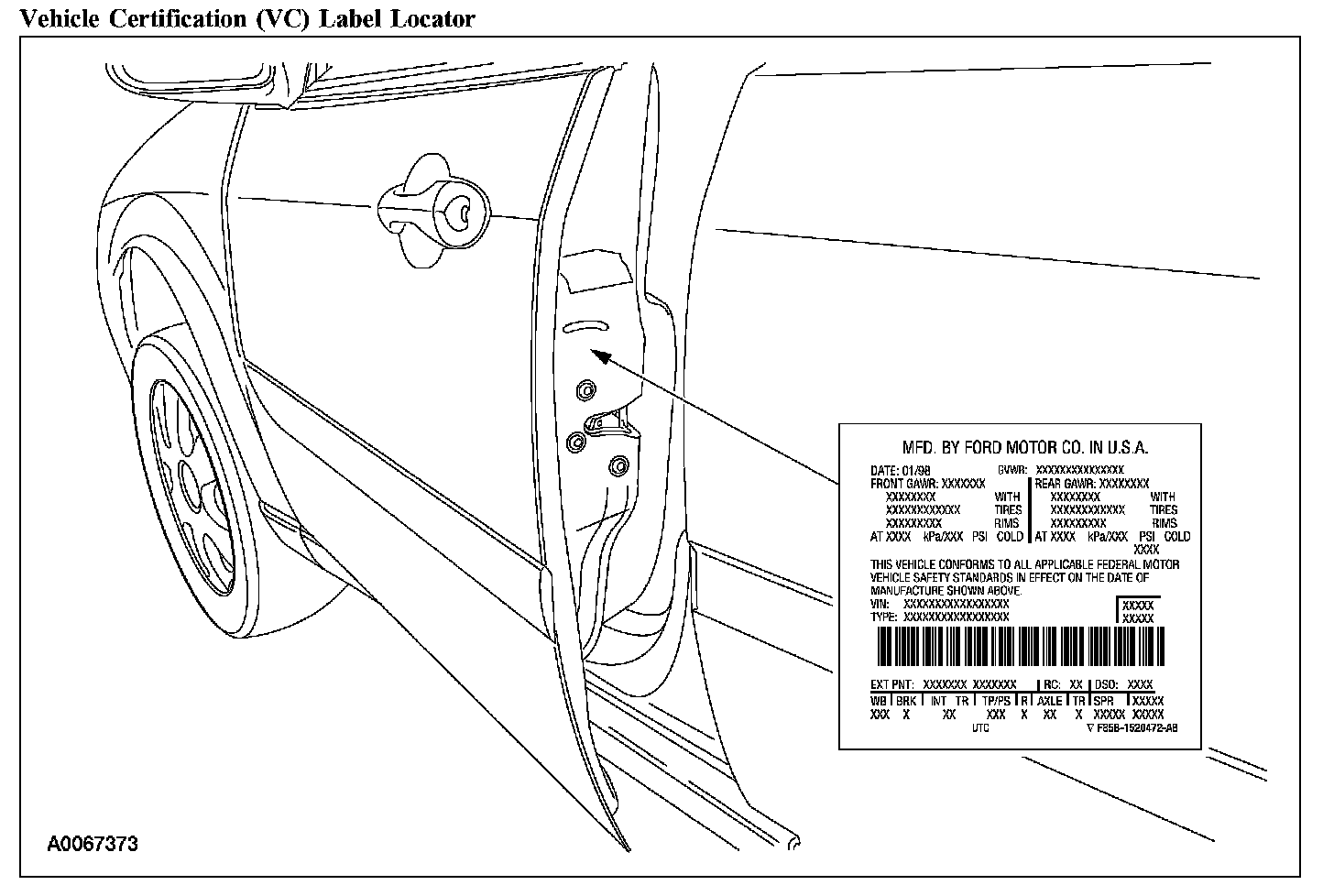 The vehicle certification (VC) label contains the manufacturer name, the month and year of manufacture, the certification statement, and the VIN. It also includes gross vehicle weight ratings (GVWR) and tire information.