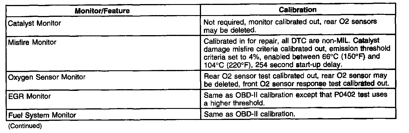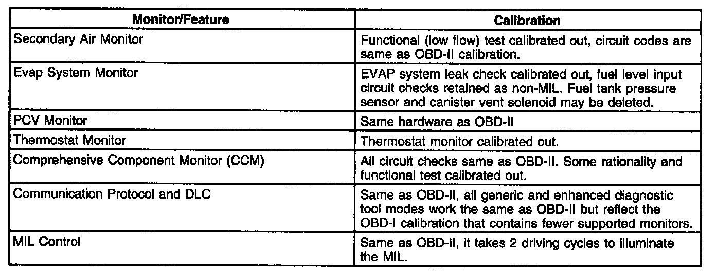 Vehicles not required to comply with OBD-II requirements will use an OBD-I system. OBD-I systems are used on all Federal truck calibrations over 8,500 lb GVWR. OBD-I vehicles use the same data communication link, data link connector (DLC), and PCM software as the corresponding OBD-II vehicle. Differences between OBD-I and OBD-II vehicles may be removal of the rear oxygen sensor(s), fuel tank pressure sensor, canister vent solenoid, and PCM calibration. The table lists what monitors and functions have been altered for the OBD-I calibration.