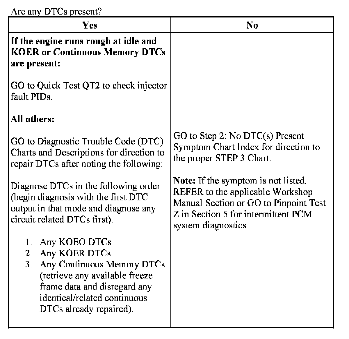 Complete the PCM Quick Test to access any DTCs. Note any key on engine off (KOEO) key on engine running (KOER) (if engine runs) and Continuous Memory (MIL and non-MIL) DTCs.