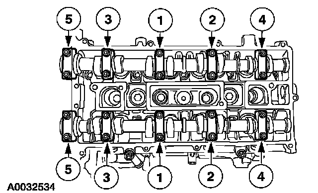 Stage 1: Tighten the camshaft bearing bolt caps one turn at a time until tight.