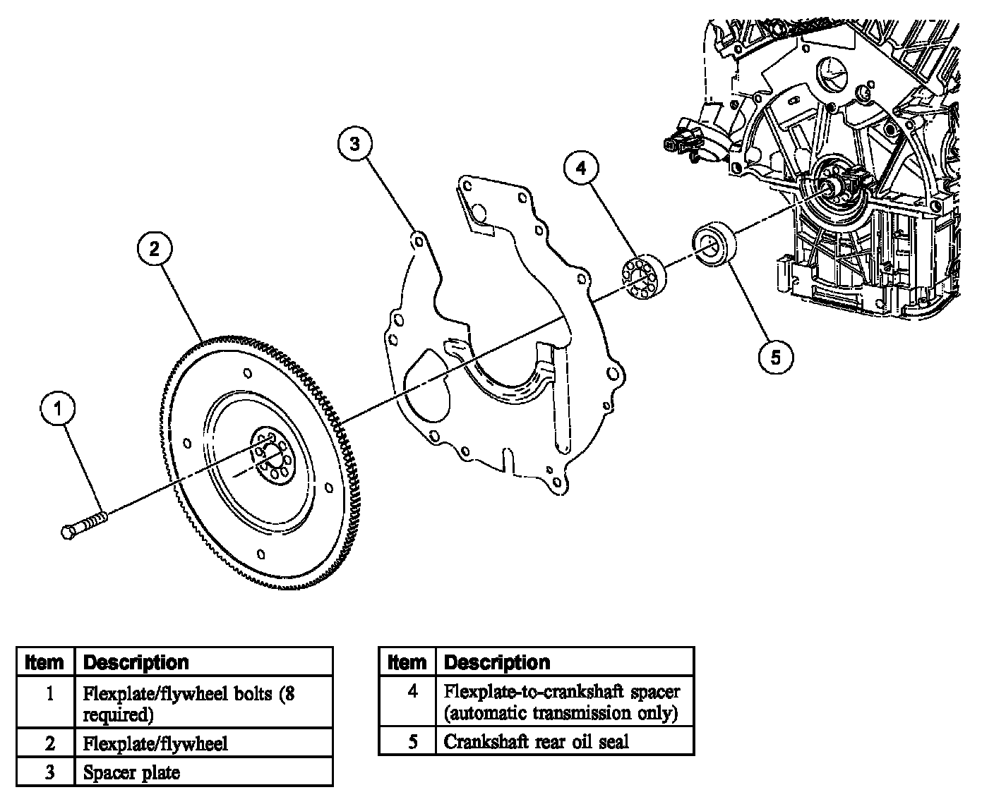 Lower End Components Exploded View, Flexplate, Flywheel and Crankshaft Rear Oil Seal