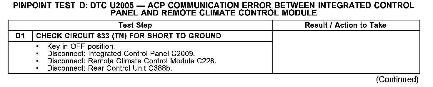 PINPOINT TEST D: DTC U2005 - ACP COMMUNICATION ERROR BETWEEN INTEGRATED CONTROL PANEL AND REMOTE CLIMATE CONTROL MODULETest D3-D5: