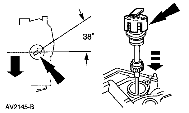 Install the camshaft synchronizer housing assembly so the arrow on the special tool is 38 degrees from the centerline of the engine.