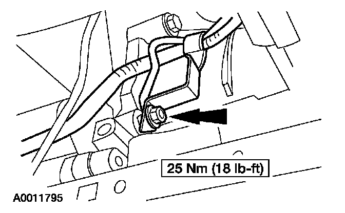 6. Remove the battery cable harness retaining bracket nut. Remove the bracket and the engine ground cable from the stud (2V).
