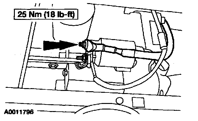 9. Remove the starter motor positive cable nut and disconnect the B+ cable. Remove the battery cable harness assembly from the vehicle.