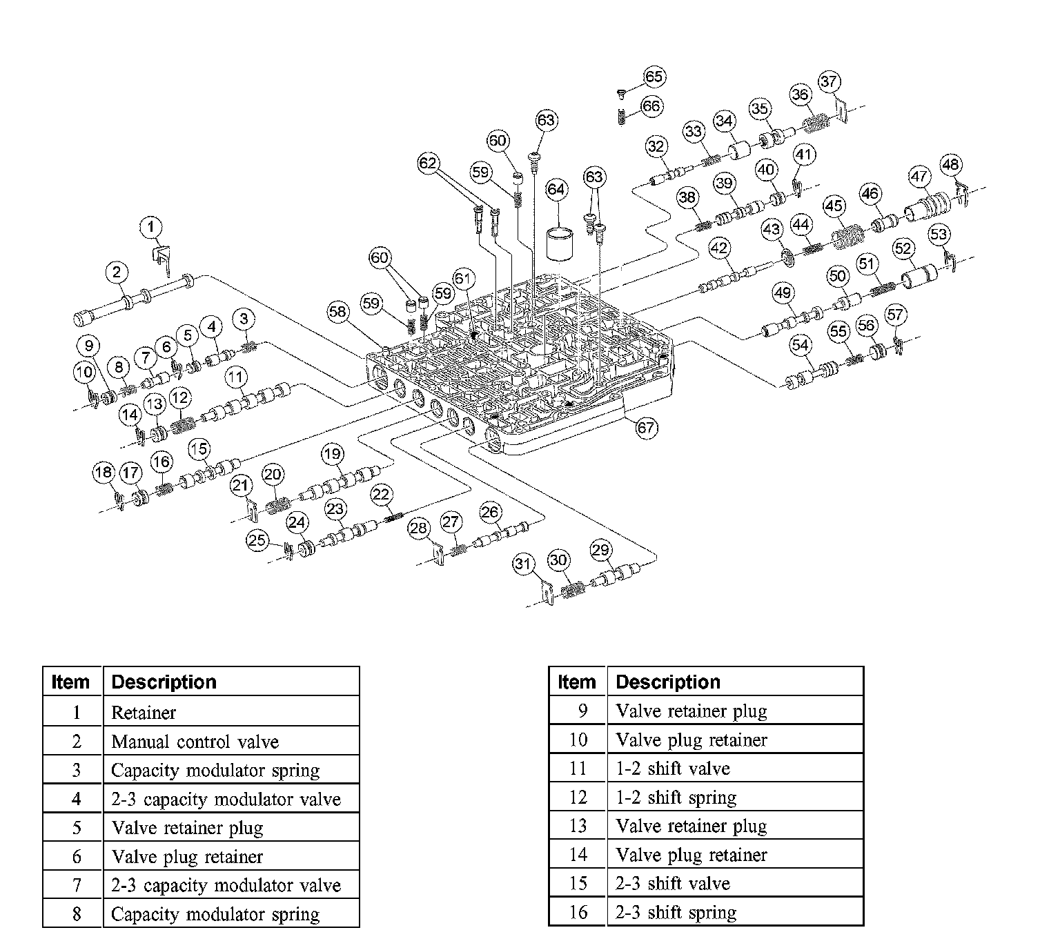 6. CAUTION: Most valves are aluminum and cannot be removed using a magnet. Remove the valves by tapping the valve body on the palm of the hand to slide the valves out of the bores. It may be necessary to remove the valves and springs using a pick. If it is necessary to use a pick, use extreme caution to prevent damaging the valves or valve bores. If necessary, disassemble parts of the main control valve body in small groups. Take special care when handling the main control components, since they are the most precise and delicate parts of the transaxle. Neatly arrange the parts as they are removed to avoid mixing similar pieces.