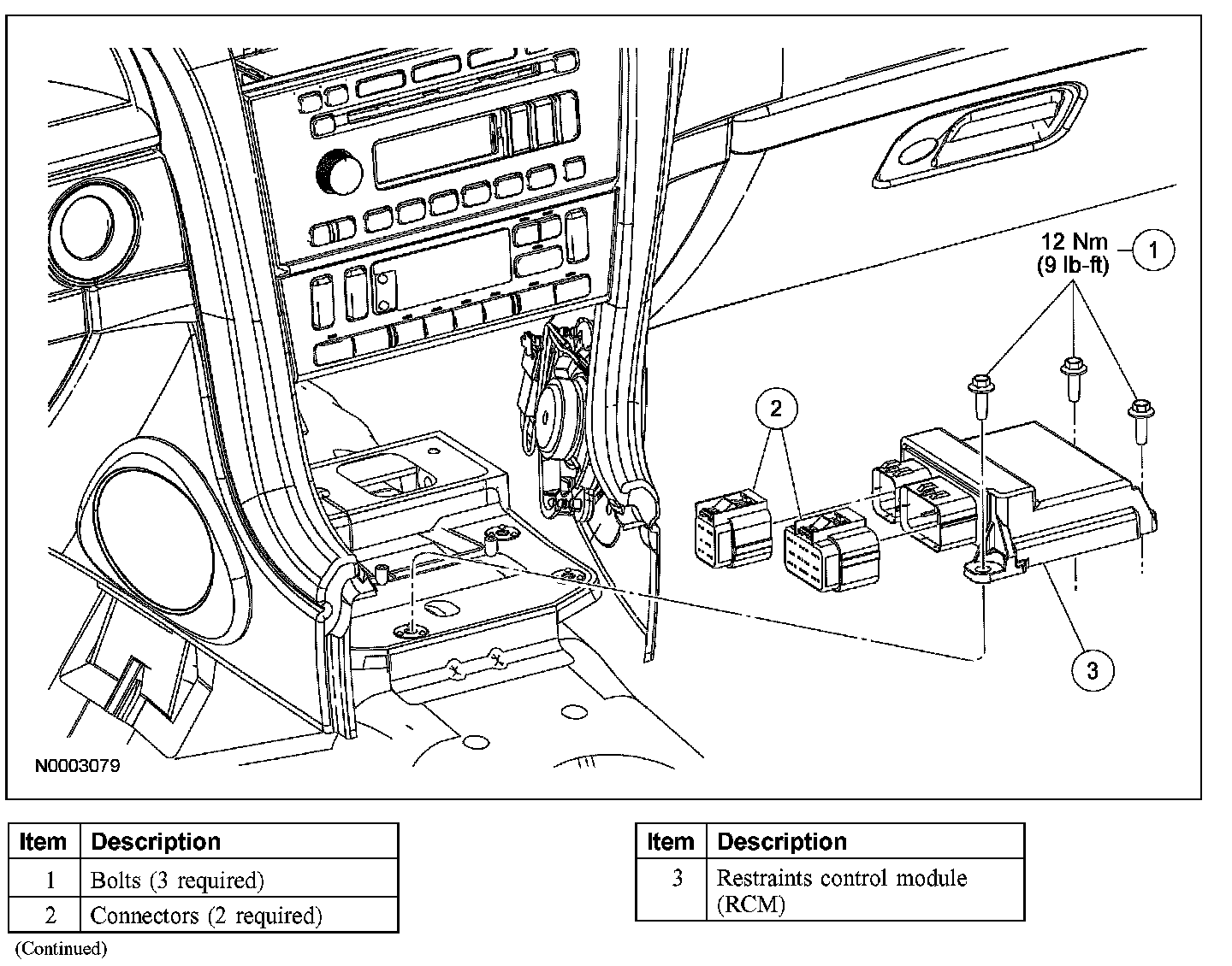 4. WARNING: The tightening torque of the air bag restraints control module (RCM) retaining bolts is critical for correct system operation.