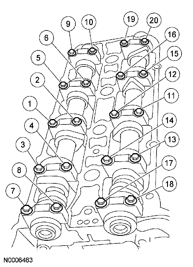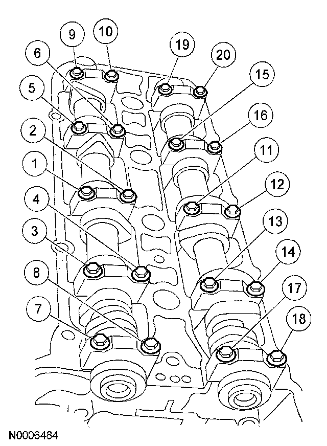 ^ Install the bearing cap bolts. Tighten the bolts in three stages in the sequence shown.