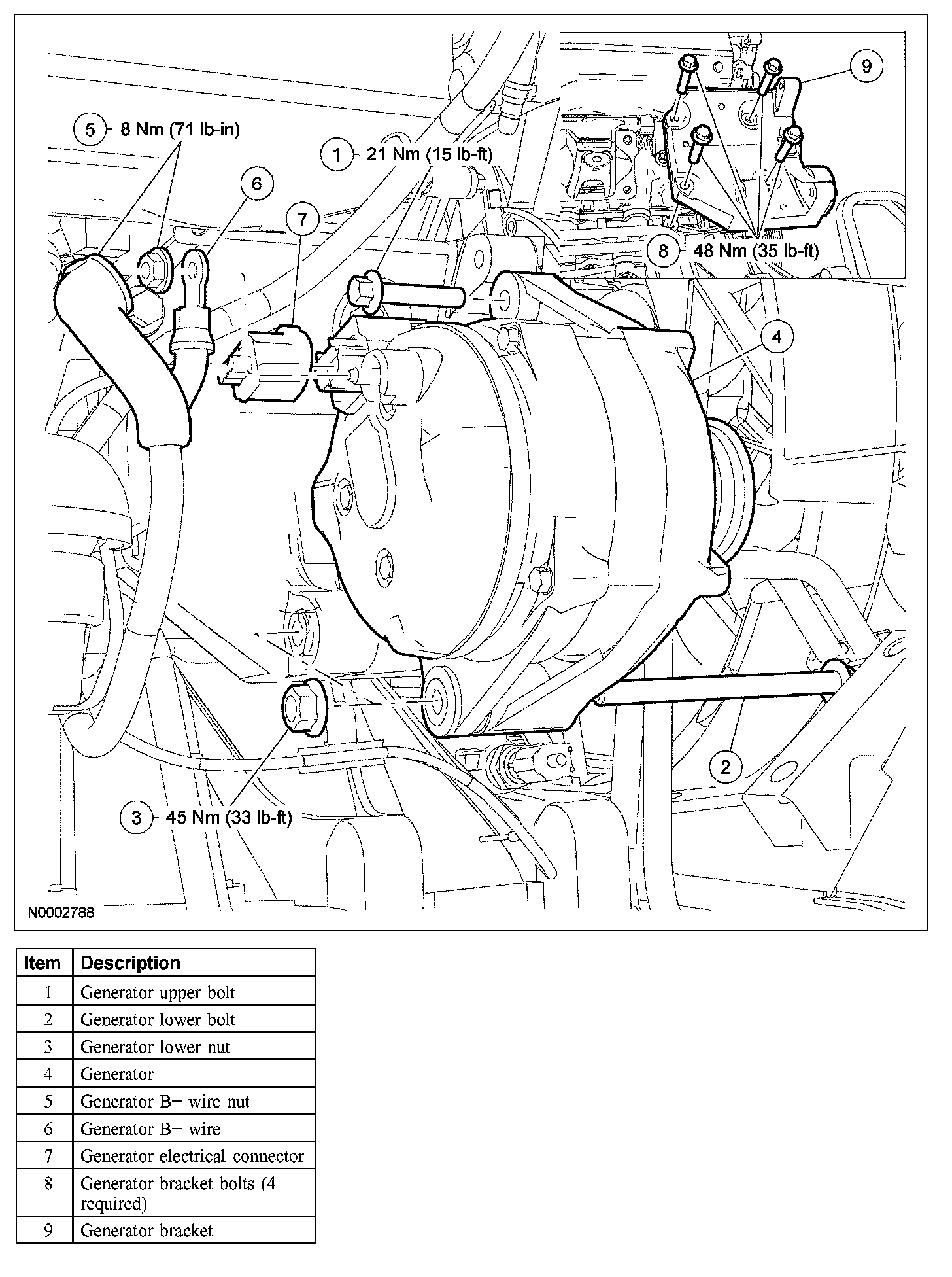 - The generator must be supported by hand after removing the bolts and prior to disconnecting the electrical connector, or damage to the harness may result.