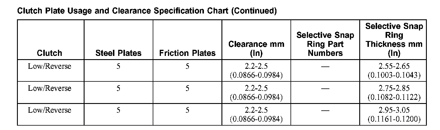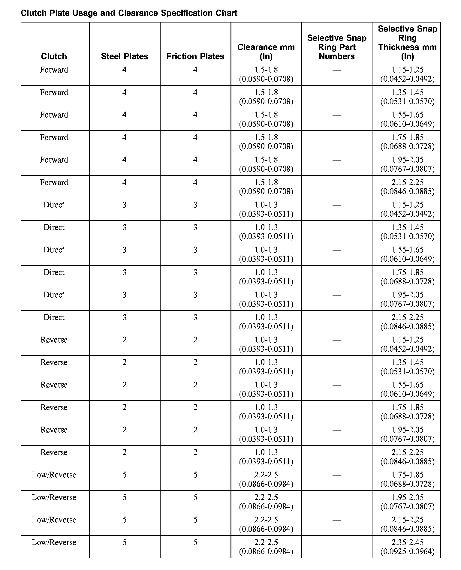 Clutch Plate Usage and Clearance Specification Chart (Part 1):