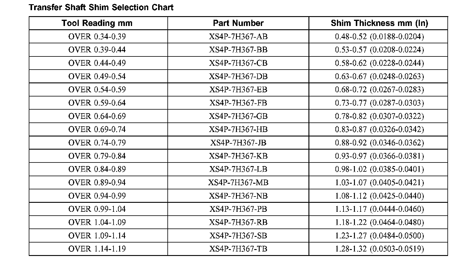 Transfer Shaft Shim Selection Chart: