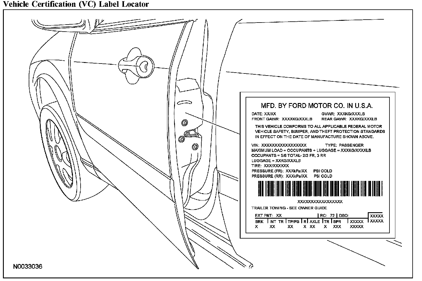 The vehicle certification (VC) label contains the manufacturer name, the month and year of manufacture, the certification statement, and the VIN. It also includes gross vehicle weight ratings (GVWR) and tire information.