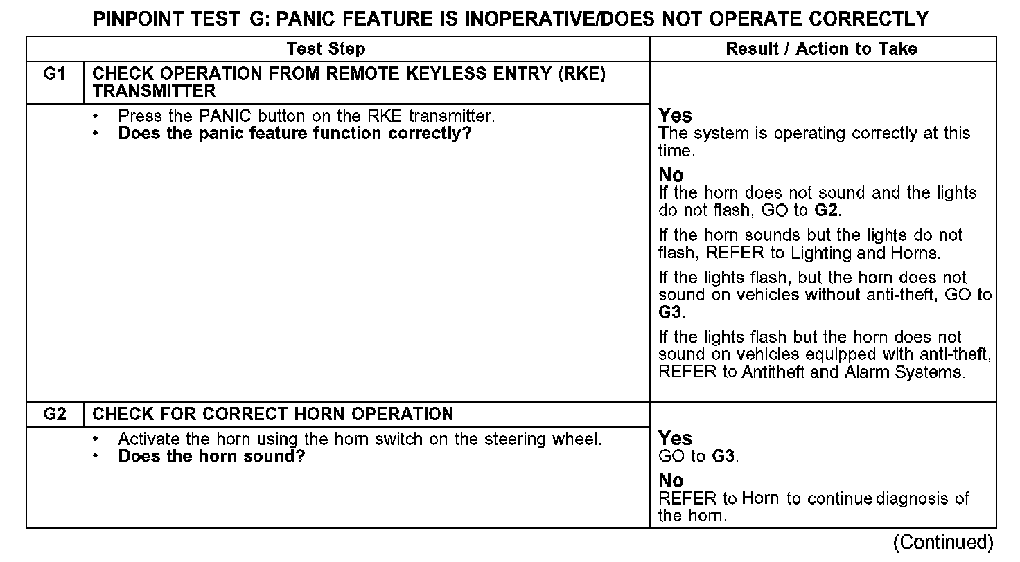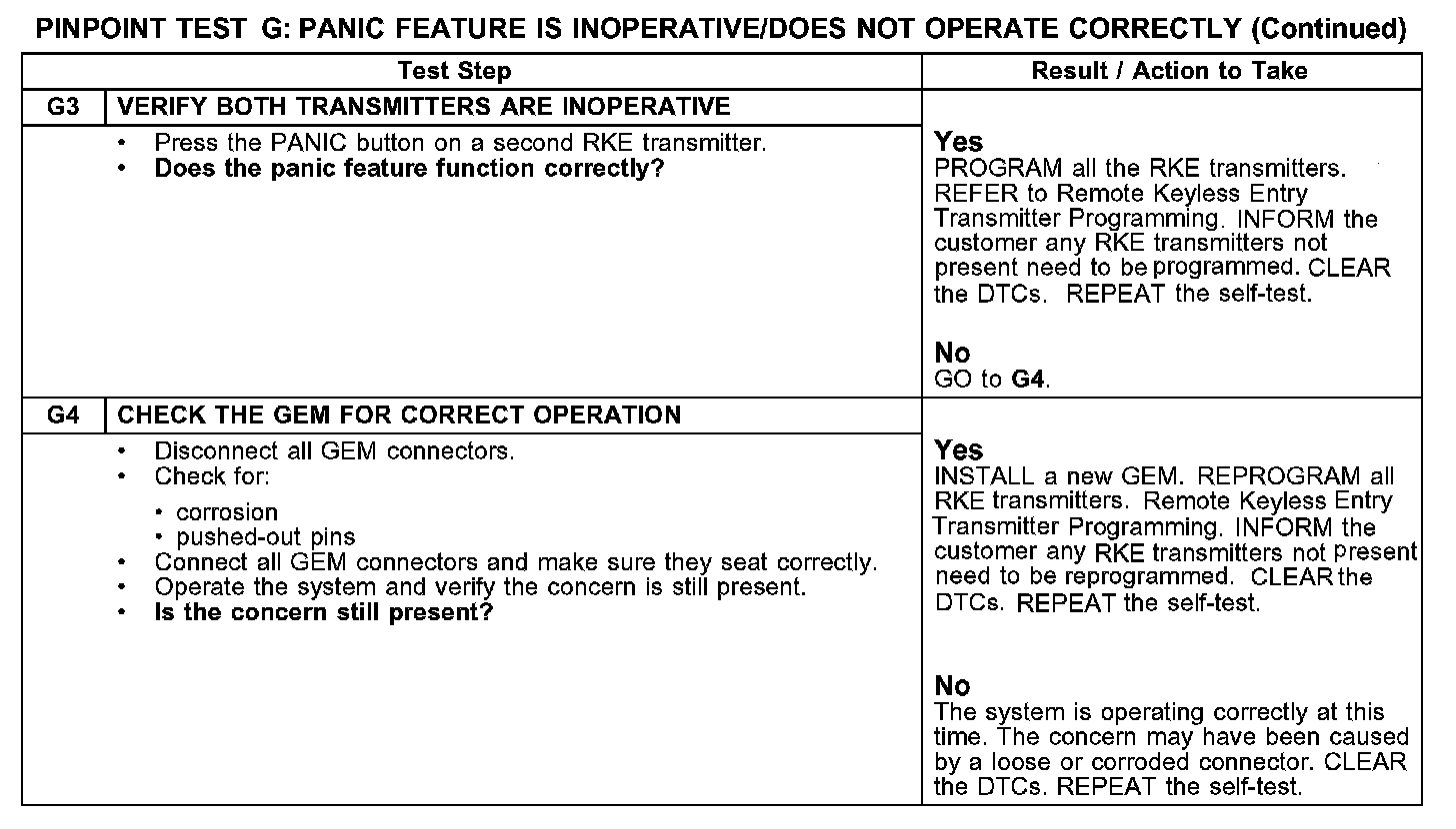PINPOINT TEST G: PANIC FEATURE IS INOPERATIVE/DOES NOT OPERATE CORRECTLYG1-G2: