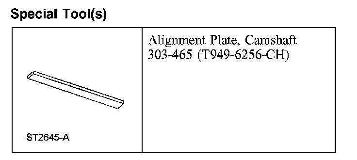 9. CAUTION: The special tool 303-465 is for camshaft alignment only. Using this tool to prevent engine rotation can result in engine damage.