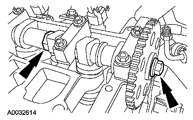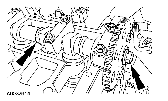 If the camshaft sprockets were not removed, use the flats on the camshafts to prevent camshaft rotation and loosen the sprocket bolts.