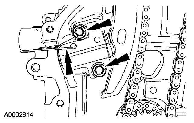 2. Remove the bolts and timing chain tensioner.
