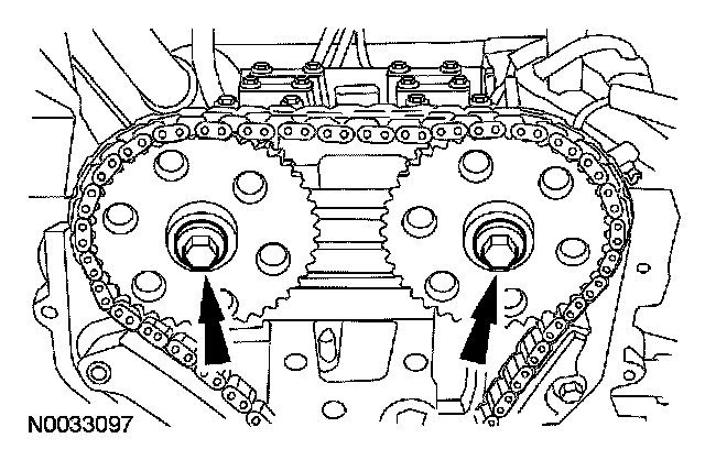 Using the flats on the camshafts to prevent camshaft rotation, tighten the sprocket bolts.
