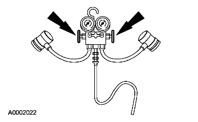 1. Turn both valves on the R-134a Manifold Gauge Set clockwise to close the low- and high-pressure hoses to the center manifold and center hose.