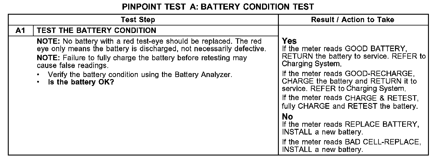 PINPOINT TEST A: BATTERY CONDITION TEST