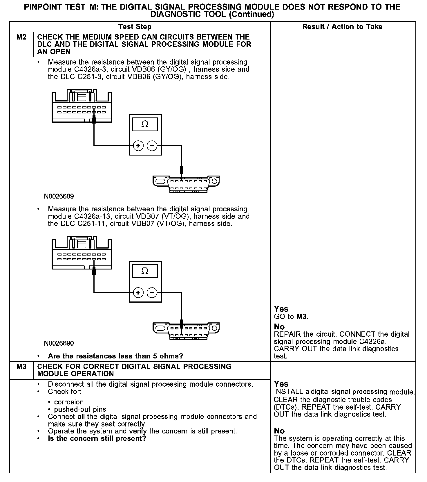 Check the medium speed CAN circuits VDB06 (GY/OG) and VDB07 (VT/OG) between the digital signal processing module C4326a and the data link connector (DLC) C251. The total resistance values must not be more than 5 ohms. If the resistance is more than 5 ohms there is an open in one of the high speed CAN circuits, damage to the DLC C251, damage to the digital signal processing module C4326a, or a problem in an in-line connector.